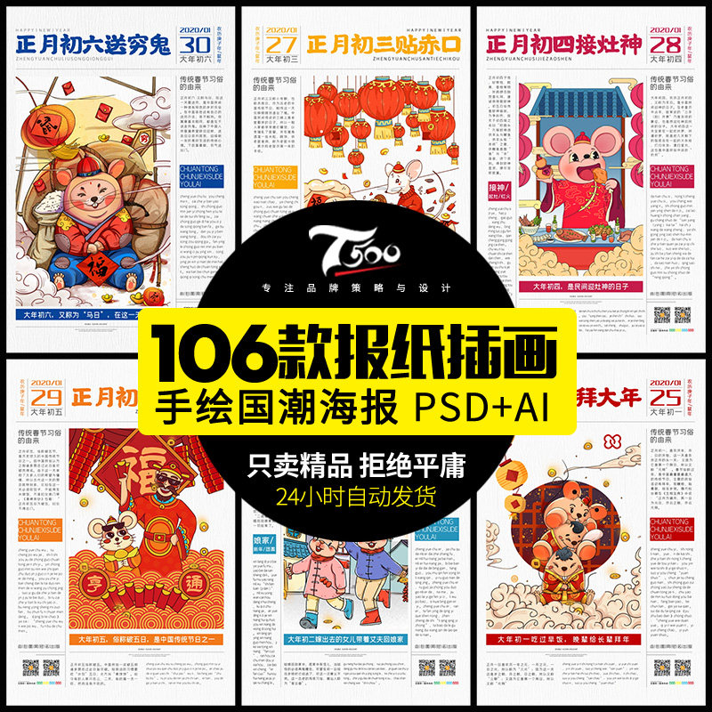 腊月正月习俗插画 四 年鼠年正月系列插画psd素材包 9套1 4gb 格子随笔